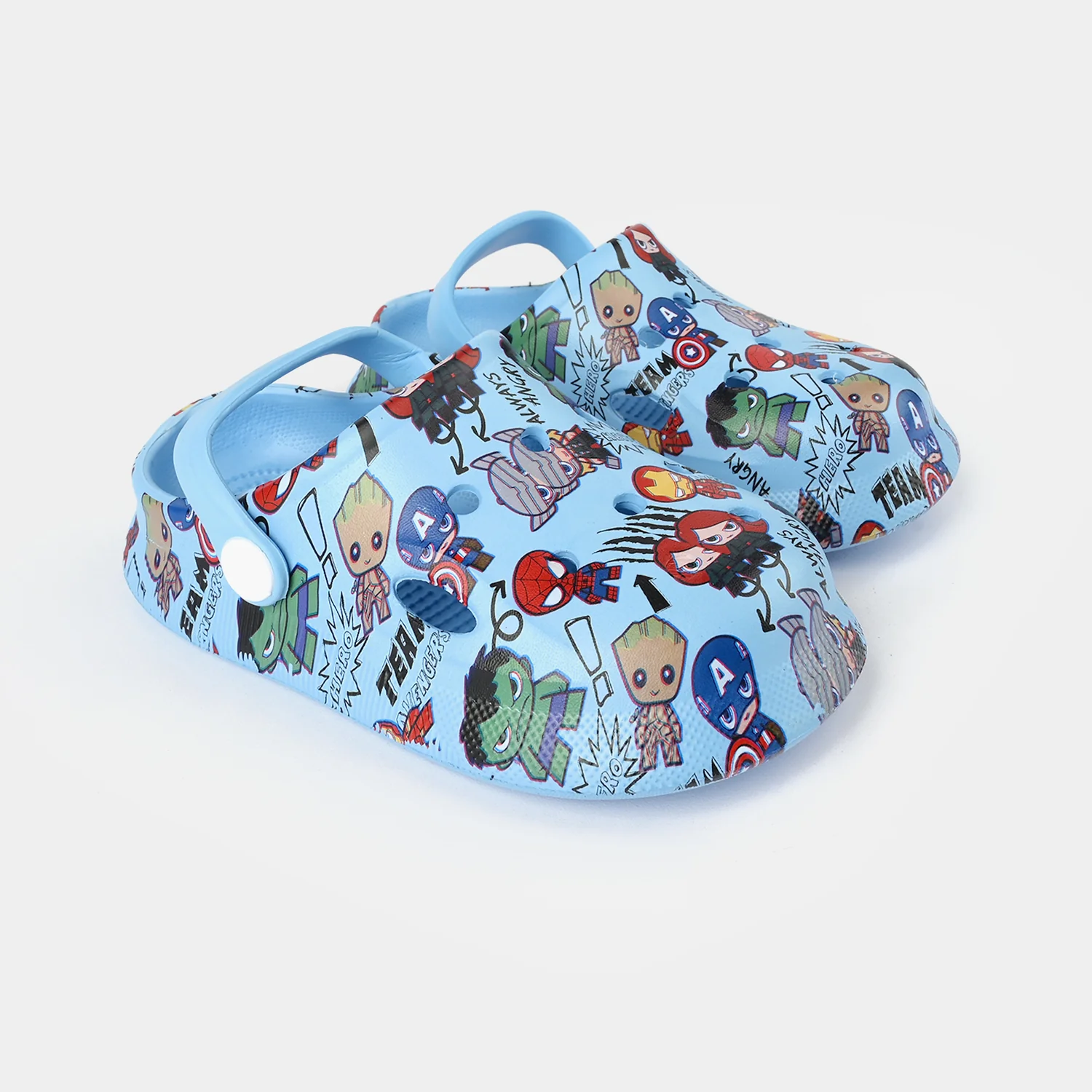 These blue character boys clogs feature an all-over print and a back strap, providing a comfortable and playful fit for everyday wear.
