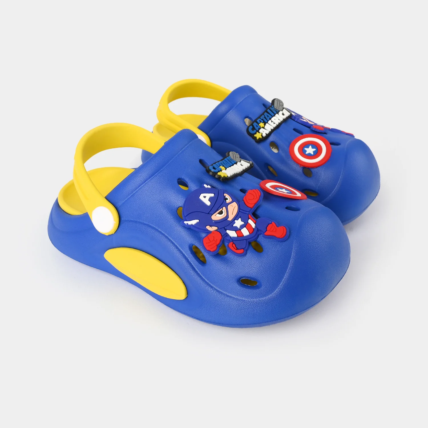 These blue boys Captain America clogs feature a fun themed design and a yellow back strap, offering a comfortable and playful fit for everyday wear.