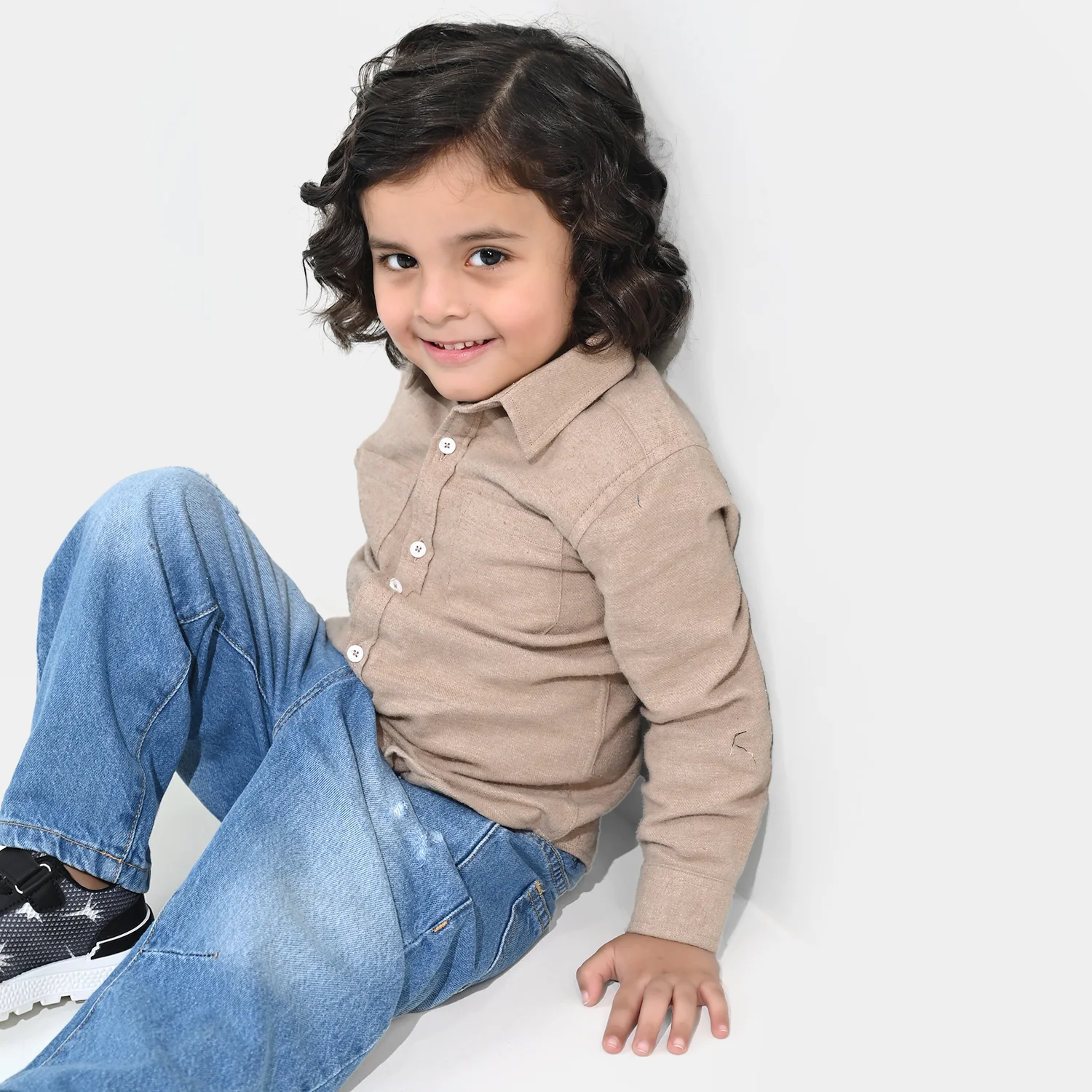 Boys beige flannel plain shirt featuring a collar, front button placket, full sleeves, and chest pockets for a smart and classic look.