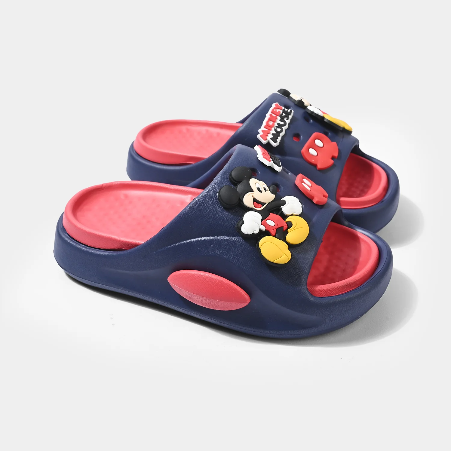 Kids’ slide sandals in blue/navy with a cute cartoon Mickey-Mouse design, bright colors, soft cushioned footbed, and easy slip-on style for everyday play.