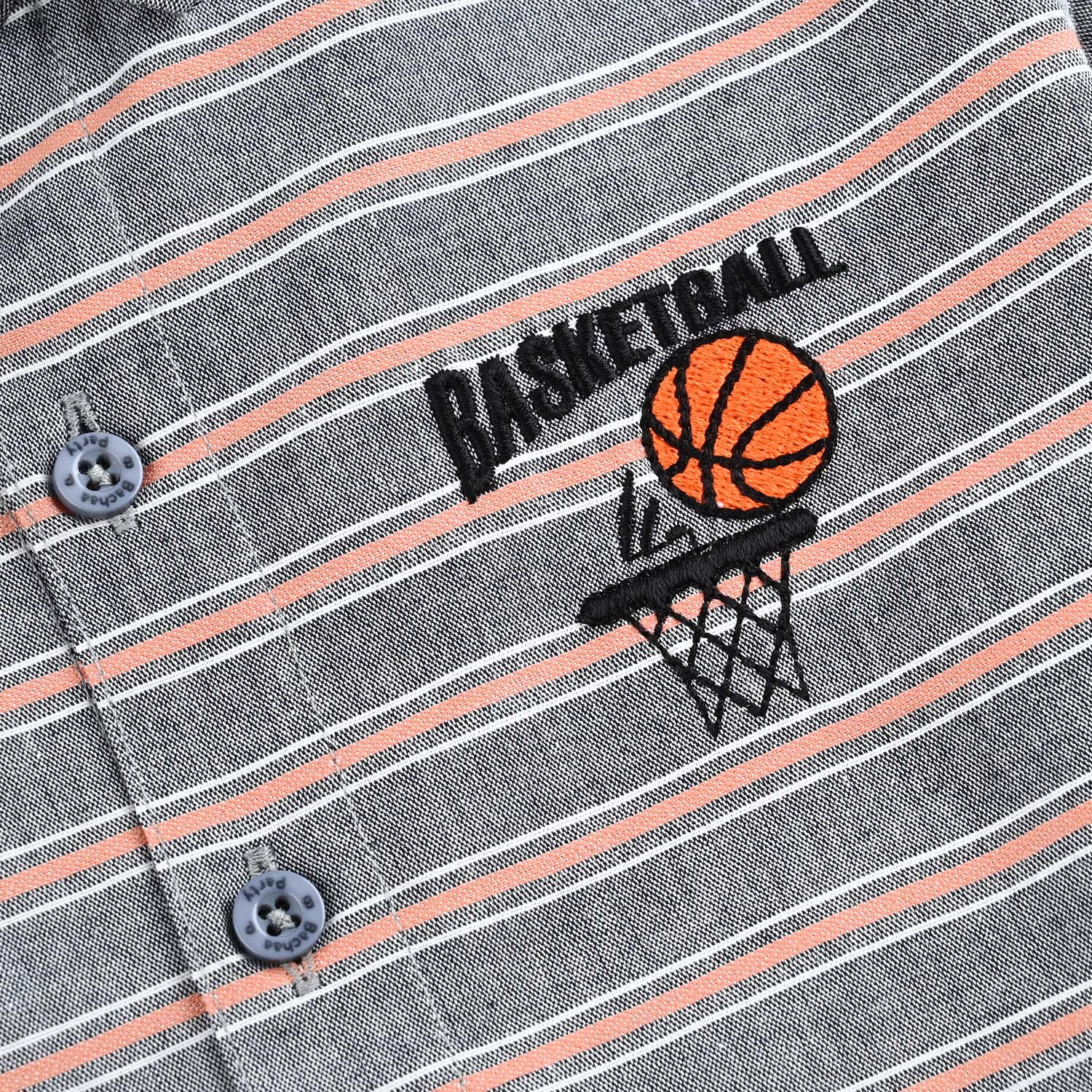 Boys grey striped shirt featuring a collar, half sleeves, front opening, and basketball-themed design, perfect to pair with shorts, jeans, or any bottoms for a casual look.