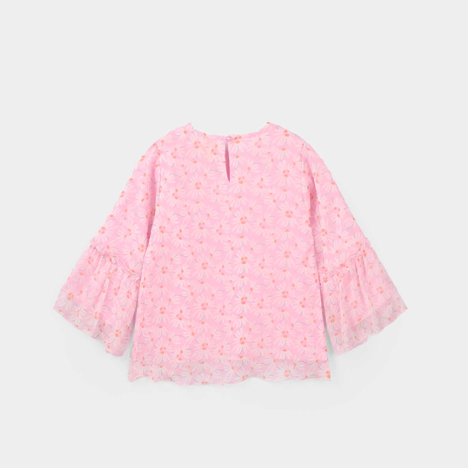 This pink girl's chiffon casual top features a floral print and full sleeves with pleated detailing and can be worn with any bottoms for a cute, everyday look.