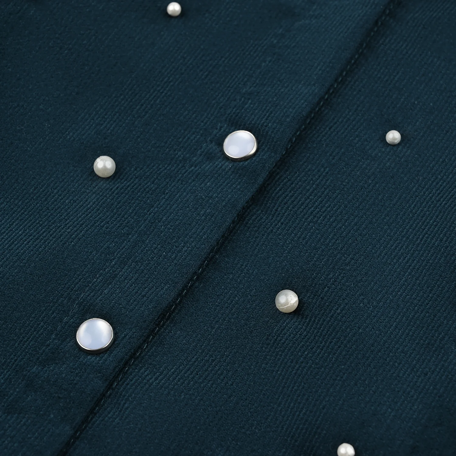 This teal-green corduroy button-down shirt for girls features pearl detailing, offering a cute and festive look for special occasions.