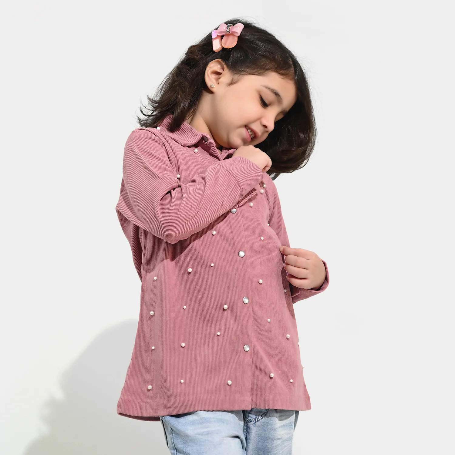 This pink corduroy button-down shirt for girls features pearl detailing, offering a cute and festive look for special occasions.
