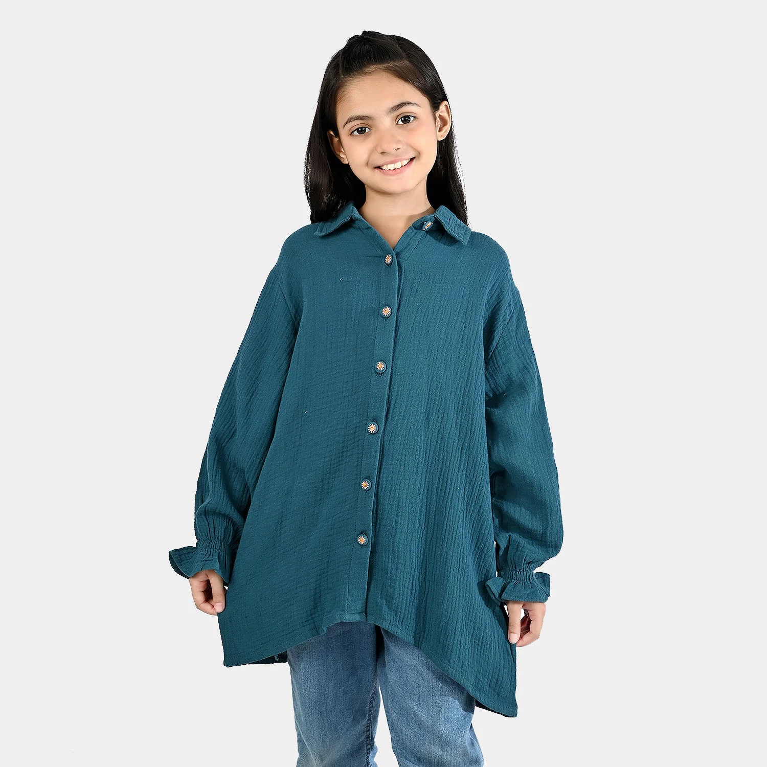 Girls teal-green button-down shirt in cotton fabric, featuring a lightweight feel and easy, everyday style.