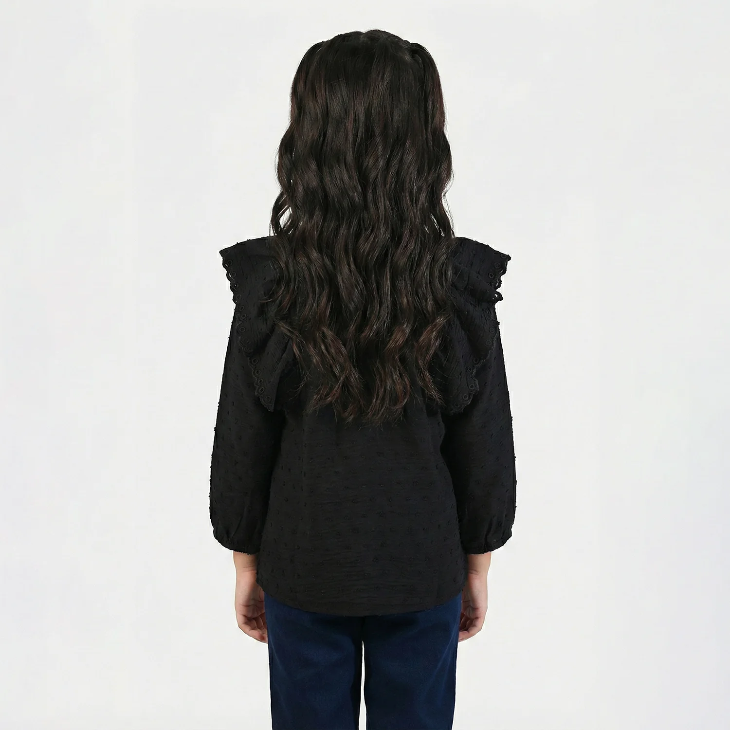 This black cotton frock-style top features a round neck, full sleeves, and front ruffle detailing. Perfect to pair with jeans or any bottom for a cute everyday look.