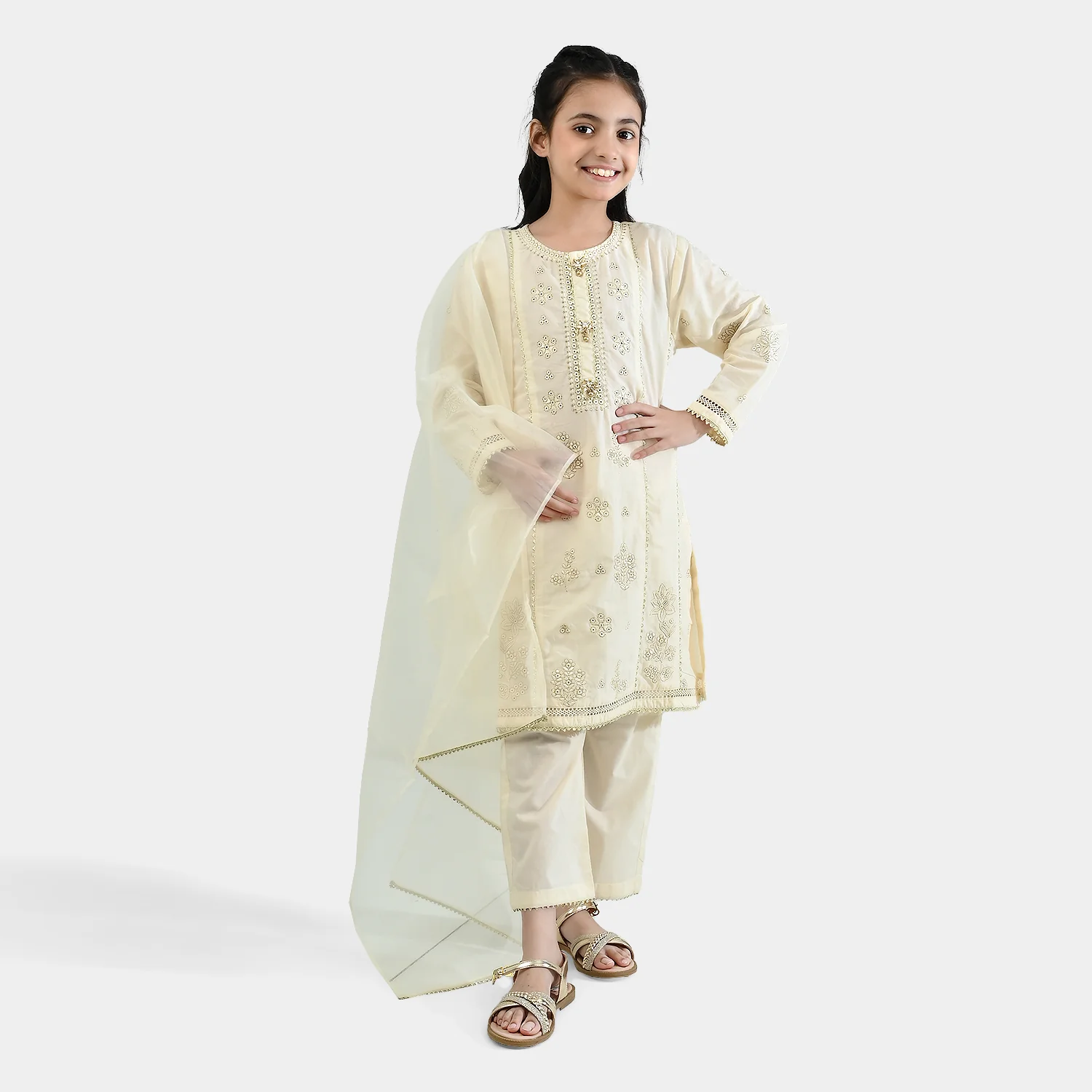 Girls white 3-piece embroidered suit with a shirt featuring neckline detailing and lace embellishments, paired with matching bottoms and a matching dupatta for all-day comfort and style.