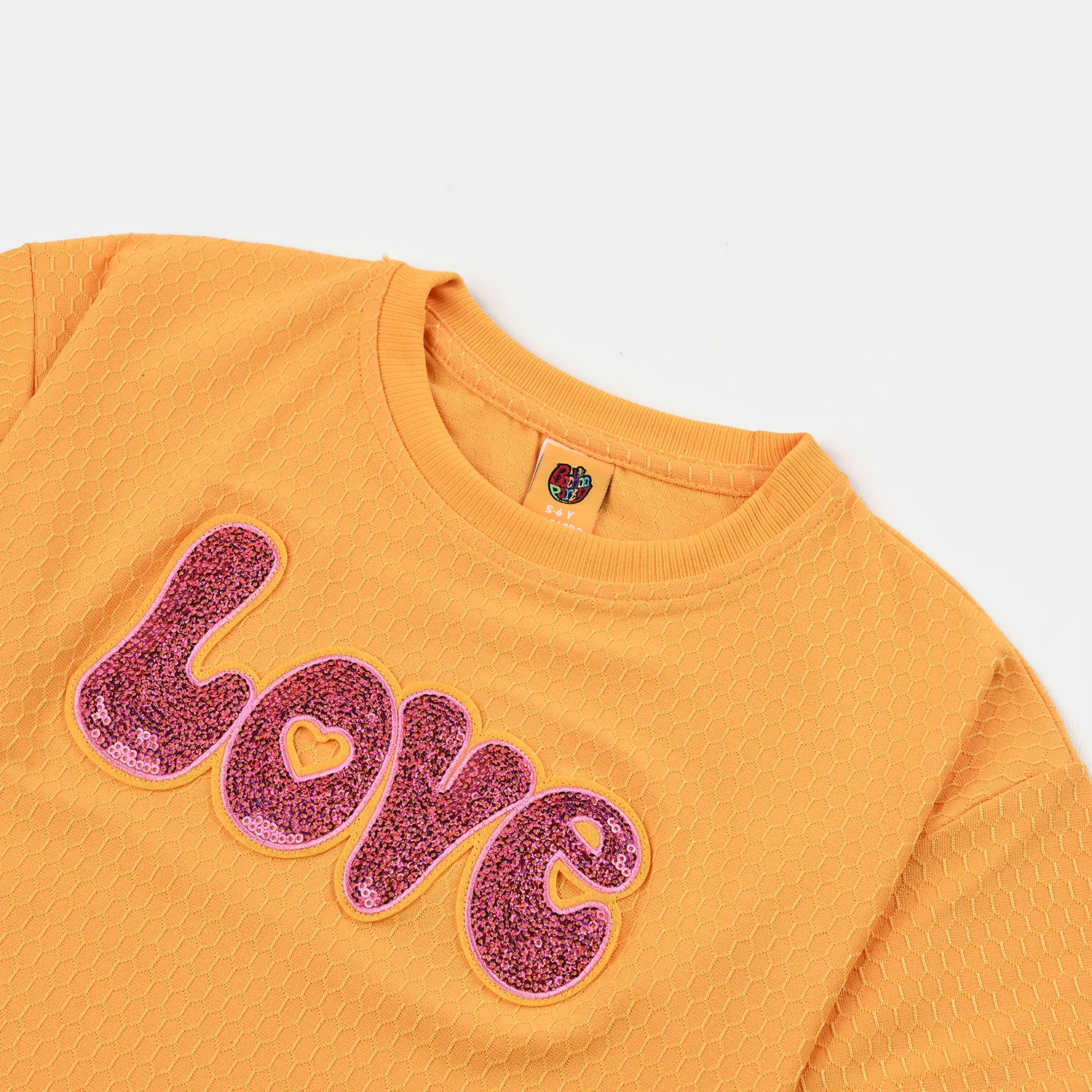 Girls yellow T-shirt featuring a round neck, "Love" text design, and half sleeves, perfect to pair with skirts, jeans, or any bottoms for a comfortable everyday look.