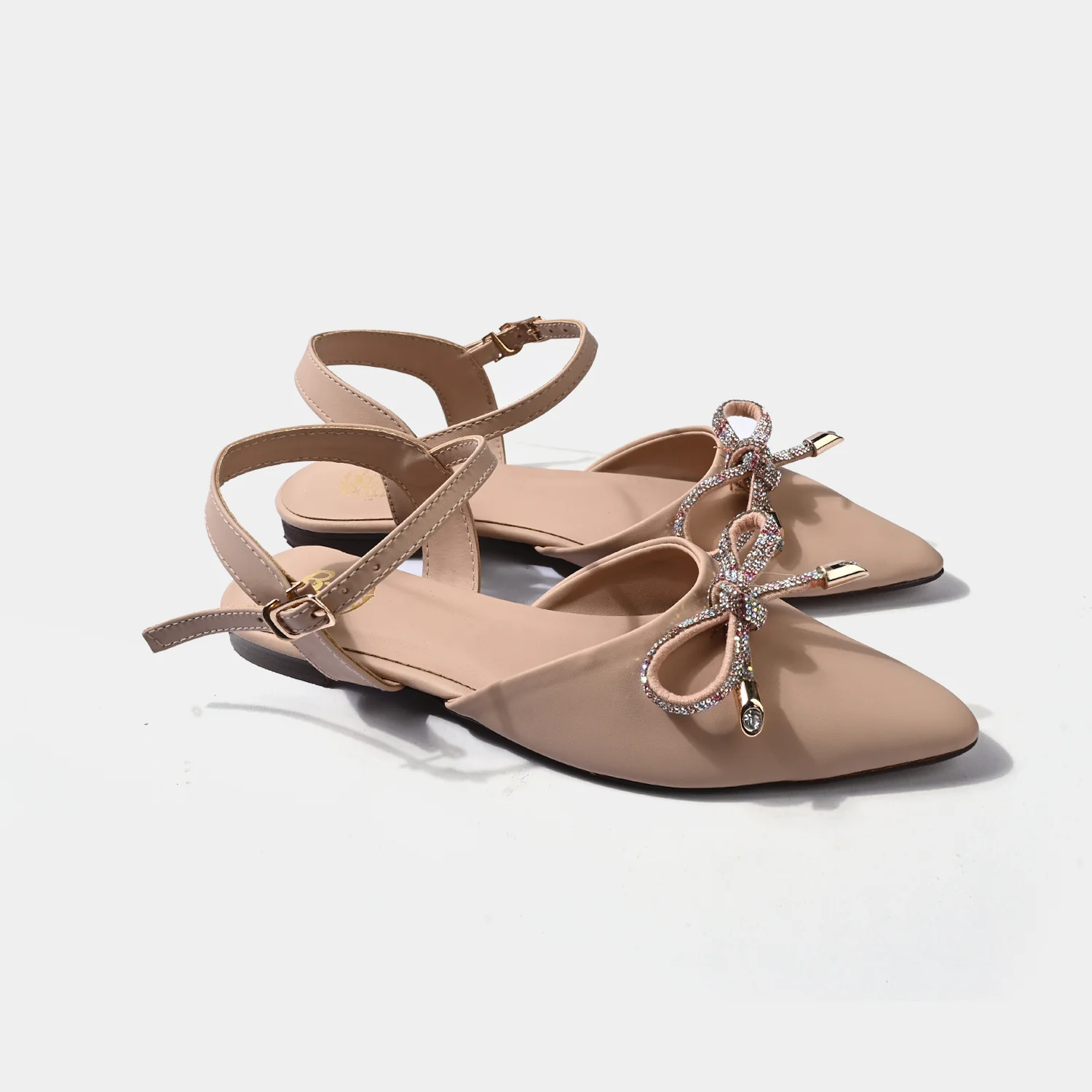 This beige flat sandal features a sleek pointed toe with a delicate embellished bow and a smooth matte finish. An adjustable ankle strap with a small metal buckle ensures a secure, comfortable fit, making it perfect for all-day wear.