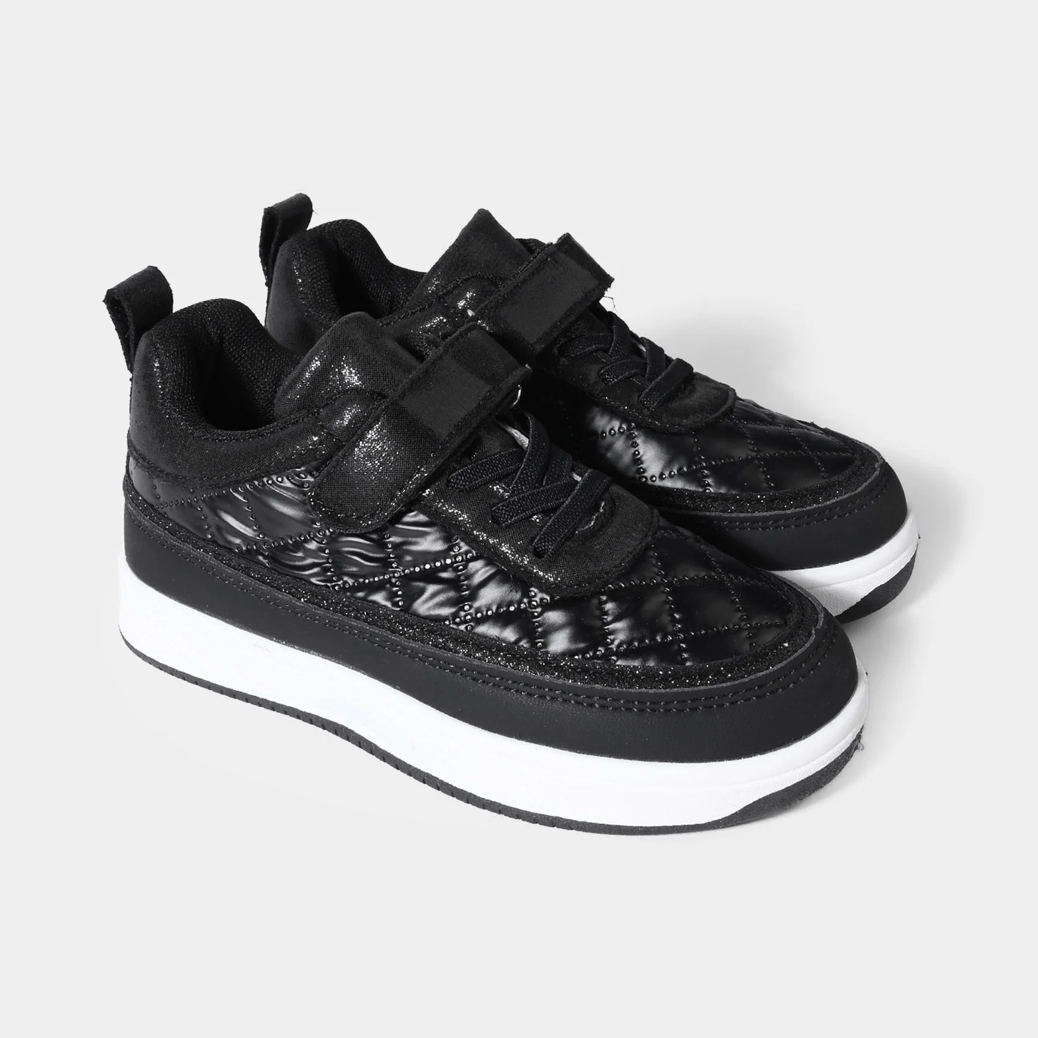 Black girls’ sneakers feature a sleek, glossy finish for a stylish look, designed with laces and a practical strap for easy wear and a secure, comfortable fit perfect for everyday use.